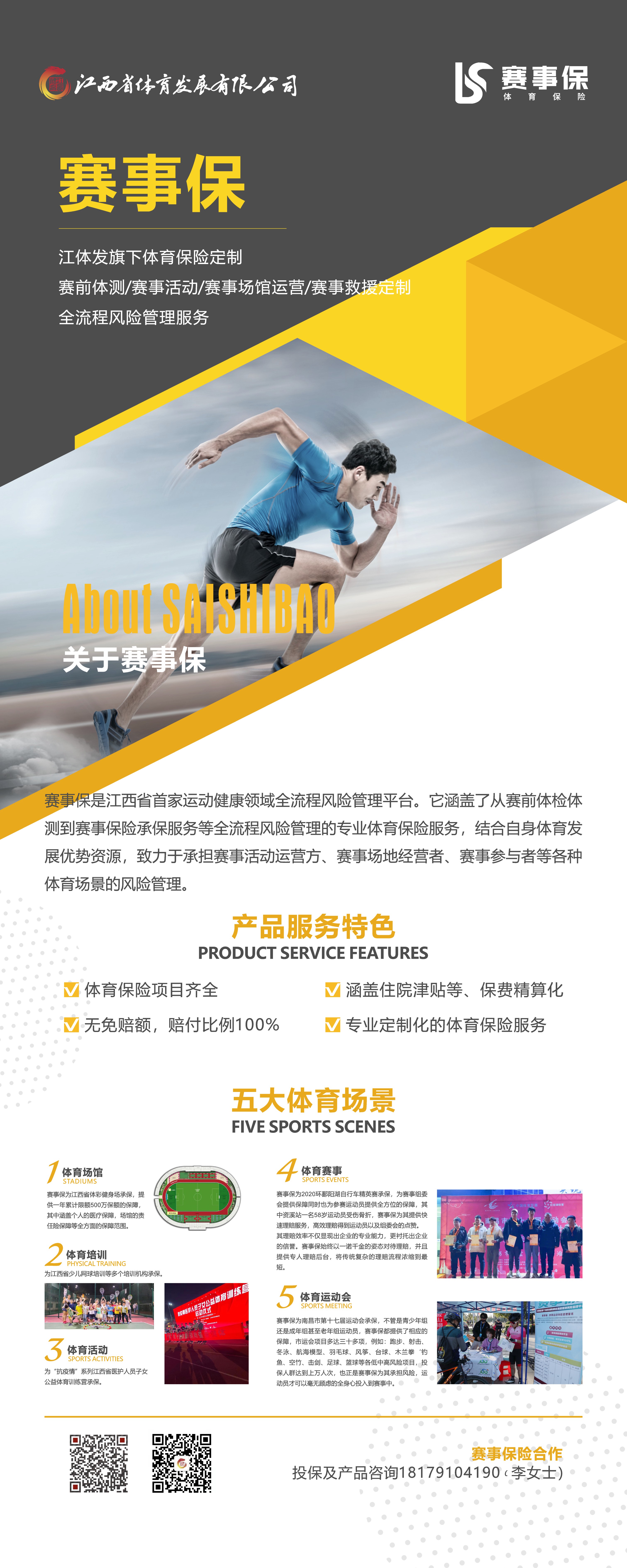 賽事保為江西體育發(fā)展有限公司旗下體育保險定制,是江西省首家運動健康領(lǐng)域全流程風(fēng)險管理平臺。涵蓋了從賽前體檢體測到賽事保險承保服務(wù)等全流程風(fēng)險管理的專業(yè)體育保險服務(wù),結(jié)合自身體育發(fā)展優(yōu)勢資源,致力于承擔(dān)賽事活動運營方、賽事場地經(jīng)營者、賽事參與者等各種體育場景的風(fēng)險管理。賽事保自成立以來,在發(fā)展體育保險事業(yè)中成績斐然,為江西省體彩健身場、江西省第六屆全民健身運動會、南昌市第十七屆運動會、2020環(huán)鄱陽湖自行車精英賽等50多項賽事活動承保,服務(wù)總保額超6億元,用專業(yè)的保險服務(wù)助力體育事業(yè)的發(fā)展。